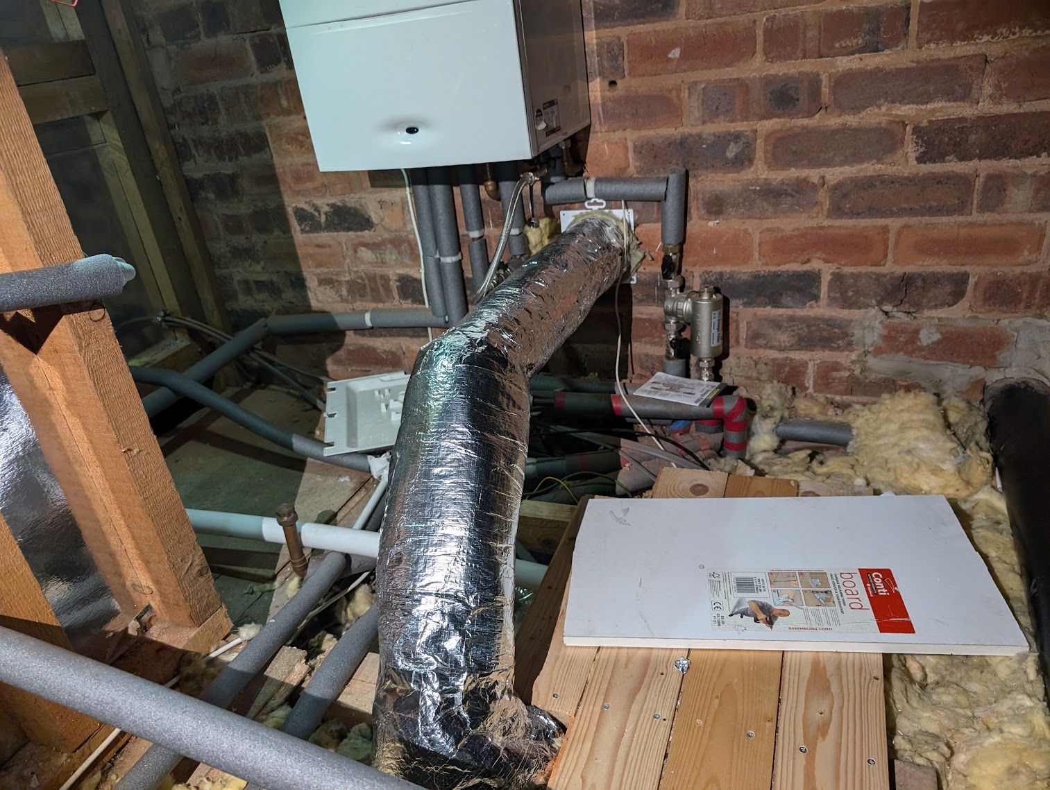 To make things more challenging, the existing hole for the cooker hood ducting was positioned tightly between boiler pipework and the central heating system. It wasn’t a straightforward route, and careful planning was needed to avoid damaging existing services while still achieving proper ventilation.